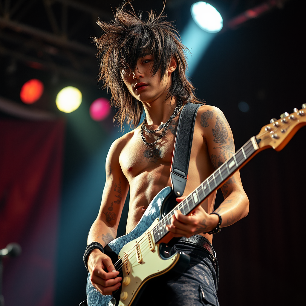 Male Japanese rockstar on stage with an electric guitar, characterized by long, tousled hair and visible tattoos. The scene is captured with a full-body perspective, using cinematic and diffused soft lighting to emphasize the realism and intricate details of skin and textures. The photograph achieves a hyperrealistic and photo-realistic quality, featuring sharp focus and real shadows, with a shallow depth of field. The image captures a dynamic energy, with high clarity in an 8k resolution; yet, it subtly hints at the imperfections of reality through cinematic noise. There are no distracting elements such as extra limbs, poorly drawn features, or disproportionate anatomy, ensuring an authentic, expressive portrayal of the rockstar's intense on-stage presence. Despite this focus, a slight artistic blur may gently frame the edges, enhancing the central subject's dramatic, vivid essence.