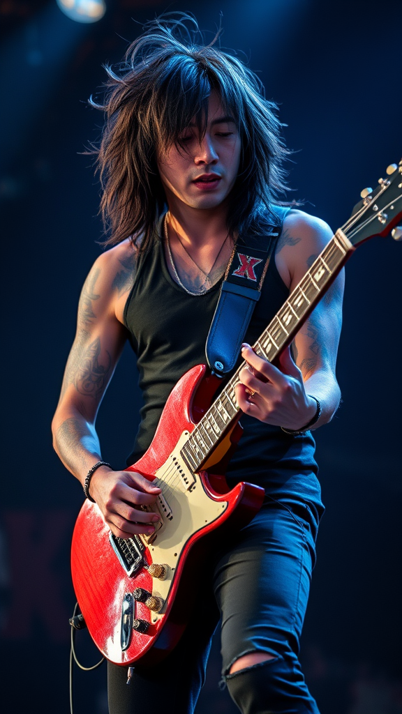 Male Japanese rockstar playing an electric guitar on stage, exhibiting long, tousled hair and tattoos, captured in a full-body shot. This photography features cinematic and diffused soft lighting, highlighting the detailed, realistic skin texture and achieving a photo-realistic, highly detailed effect. The image employs a shallow depth of field with sharp focus and real shadows, embodying hyperrealism in 8k resolution. It avoids undesirable elements such as poor quality, jpeg artifacts, or any distortions. Emphasizing a striking presence, the subject is captured with artistic imperfections outside of frame, maintaining authenticity and dynamism, while avoiding any exaggerated or incorrect anatomy.
