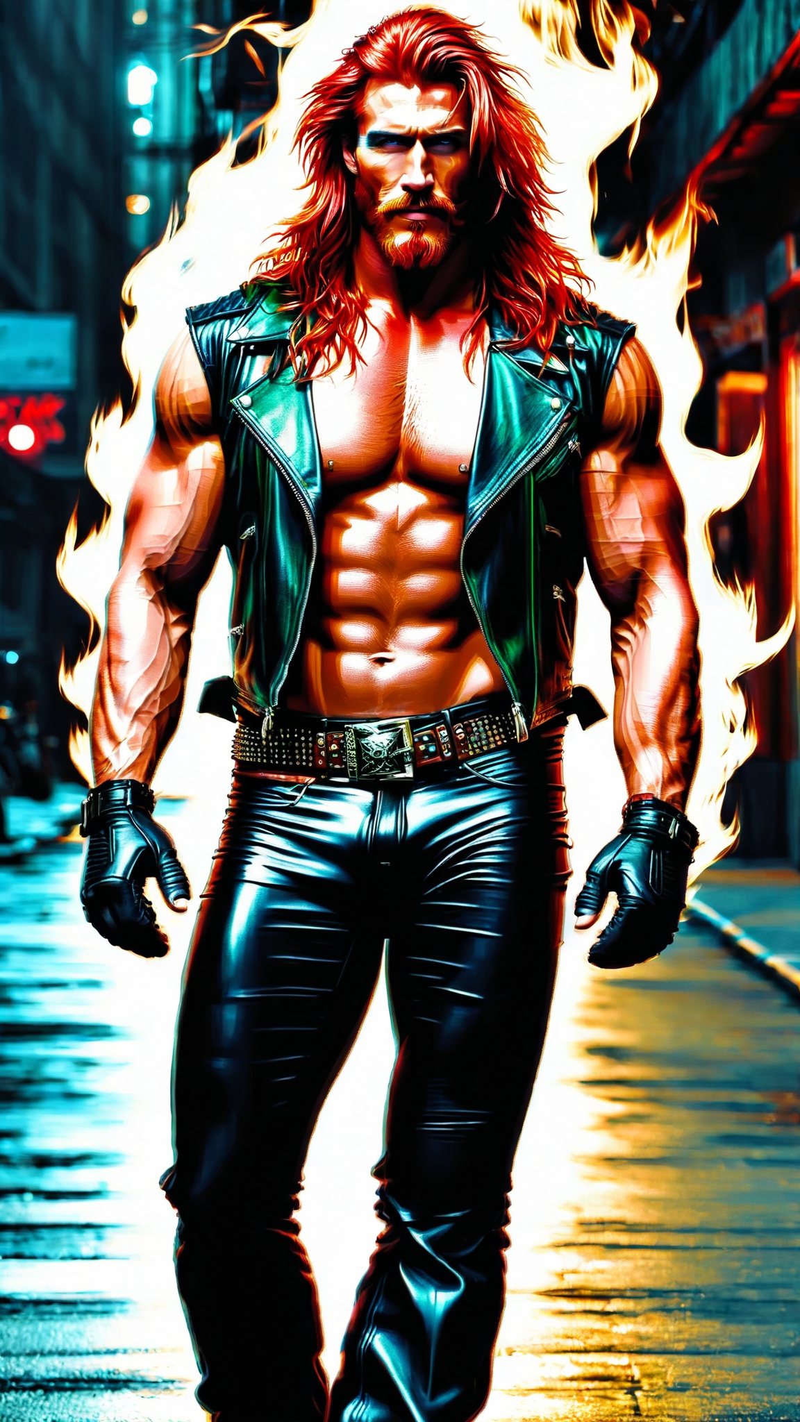 Male motorcycle/biker gang member. Heavy Metal, Hard Rock. Mature man, handsome face, thick red goatee, jade green eyes, masculine, manly, very tall, muscular, sinewy, broad chest, big biceps. long wild locks of flaming red hair, slightly hairy chest, tattoos on arms and chest. Black leather vest exposing chest. black leather pants and boots, studded belt around waist. Surly grin. lying back, legs open, huge crotch. Full body pose.