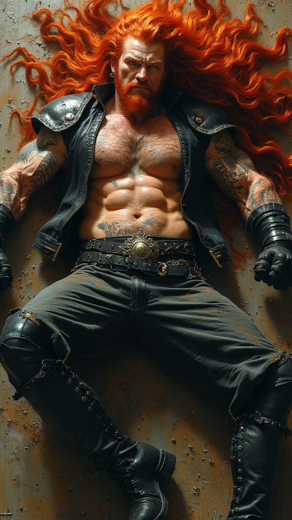 Male motorcycle/biker gang member. Heavy Metal, Hard Rock, motorcycles. Handsome face, thick red goatee, jade green eyes, strong brow and jaw. Masculine, manly, very tall, muscular, sinewy, broad chest, big biceps. Long wild locks of flaming red hair, slightly hairy chest, tattoos on arms and chest. Black leather vest open and exposing chest. Black leather pants and boots, studded belt around waist. Surly grin. Lying back, legs open, huge crotch, full body pose.