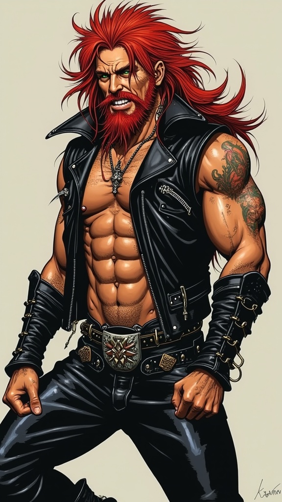 Male motorcycle/biker gang member. Heavy Metal, Hard Rock, motorcycles. Handsome face, thick red goatee, jade green eyes, strong brow and jaw. Masculine, manly, very tall, muscular, sinewy, broad chest, big biceps. Long wild locks of flaming red hair, slightly hairy chest, tattoos on arms and chest. Black leather vest open and exposing chest. Black leather pants and boots, studded belt around waist. Surly grin. Leaning back, legs open, huge crotch, full body pose.
