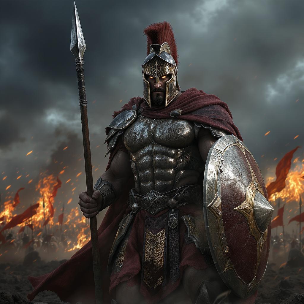 View this AI-generated image featuring a heroic male spartan warrior stands defiantly on a dramatic battleground facing the camera his finely detailed helm and masterfully crafted armor gleam with intricate designs he grips a sturdy spear and a massive shield each marked with elaborate details the s
