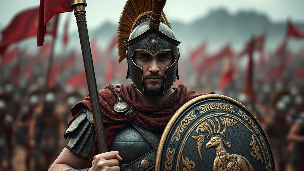 Male Spartan warrior on a battlefield, facing the camera with finely crafted helm and armor, holding an ornate spear and shield, showcasing intricate designs and high-detail artistry. The scene is ultra-realistic with photorealistic quality, captured in cinematic style with overcast lighting effects and realistic reflection mapping. The rendering is of movie-quality using advanced techniques like octane rendering, ensuring sharp focus with 8k clarity and depth of field. Realistic shadows and VFX post-production elements enhance the visual, while RTX ray tracing lighting highlights the details, maintaining a powerful and dramatic atmosphere.