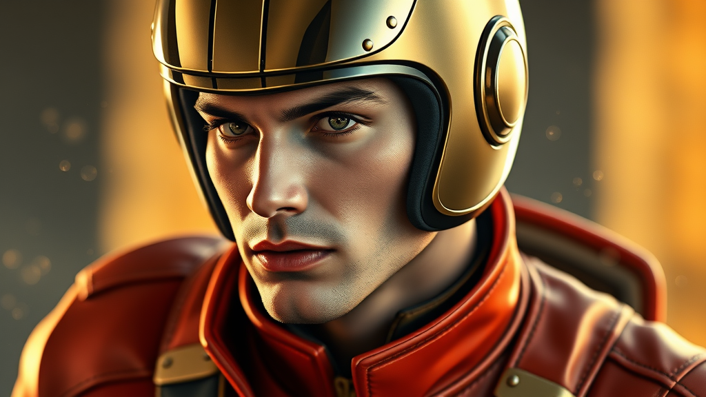 Male superhero in a Rocketeer-inspired outfit, featuring a sleek, polished helmet without any symbols. The suit closely resembles the iconic one from the Rocketeer movie, exuding an air of vintage charm while showcasing modern updates with intricate detailing. The face is meticulously detailed, with expressive, piercing eyes that convey a sense of resolve and intelligence, a real and distinct visage that stands out. His physique reflects peak fitness, illustrating strength and agility. The full body portrait is captured in stunning 8k resolution, offering hyper-realistic detail and intricacy. The art style combines the cinematic lighting and elegance reminiscent of Greg Rutkowski, Artgerm, WLOP, and Alphonse Mucha. Using a triadic color palette, the artwork’s dynamic composition and vibrant hues capture the essence of heroic grandeur. Rendered as splash art that is trending on Artstation, the piece exhibits an unparalleled sense of motion and energy, evoking the timeless allure of classic heroism with a modern twist, while subtle creative nuances imbue a fresh artistic narrative.