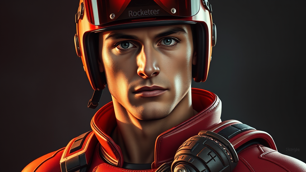 Male superhero in a Rocketeer-inspired outfit without a symbol, wearing a Rocketeer helmet. His face is detailed and real, with expressive and detailed eyes, showcasing a fit and athletic physique. The portrait is in 8k resolution, done in concept art style by Greg Rutkowski, Artgerm, WLOP, and Alphonse Mucha, with cinematic lighting. The image is hyperdetailed and intricately crafted, resembling splash art trending on Artstation, utilizing a triadic color scheme. Small creative elements are added, like futuristic gadgets on the belt and a high-tech wrist device, while maintaining the core essence of a classic Rocketeer superhero.