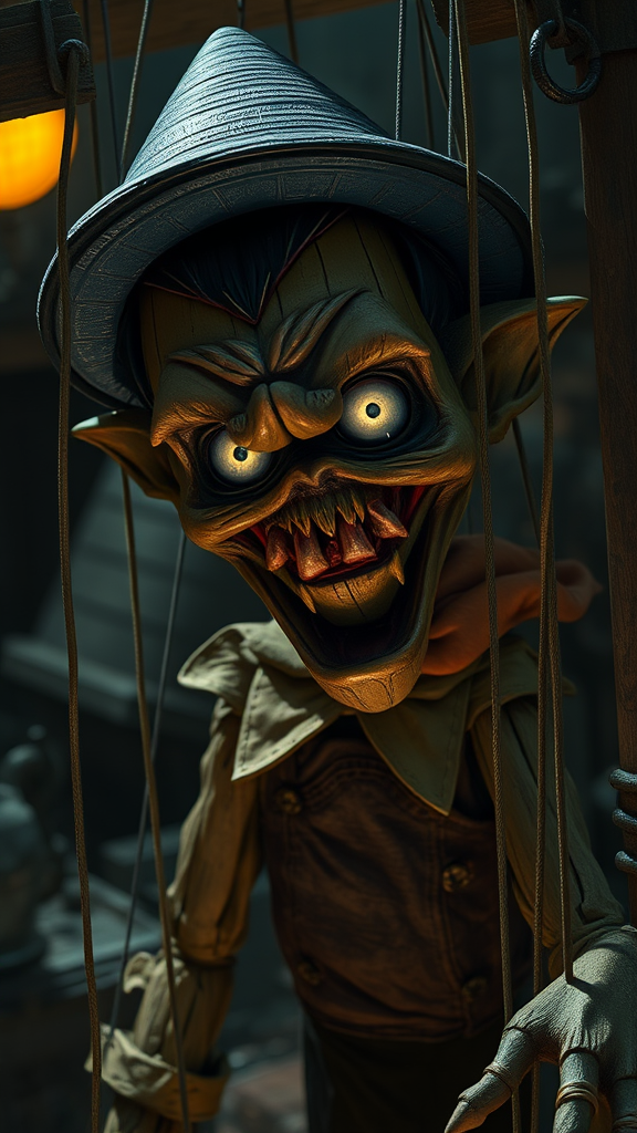 Malevolent and distorted marionette Pinocchio, his wooden features contorted into a sinister grin, eyes glowing with an unsettling light, detailed marionette strings like dark tendrils, set within a shadowy, eerie workshop, in the style of Dungeons & Dragons fantasy art, atmospheric and richly detailed.