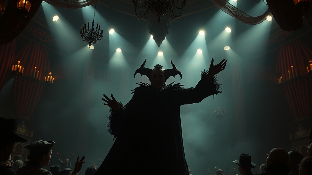 A nefarious, malevolent ringmaster orchestrates a macabre and twisted circus of nightmares, where shadows dance with eerie precision and horror lurks at every turn, drawing the audience into a dark spectacle of grotesque wonder. The show is drenched in foreboding atmosphere, with elaborate and intricately designed sets that hint at secrets hidden in every corner. The dramatic lighting casts long, sinister shadows, adding depth and intensity to the scene. Each moment is expressed in a photorealistic, cinematic style, capturing the chilling essence of the performance in stunning 8k detail, creating a hauntingly immersive experience.