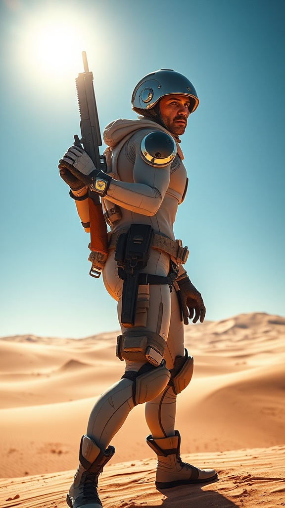 View this AI-generated image featuring a futuristic man adorned in a seamless tactical suit stands resolute amidst a vivid desert landscape the expansive dunes stretching under an intense azure sky the sun casts dramatic sunlit shadows accentuating the powerful stance of the figure in his hand he gr