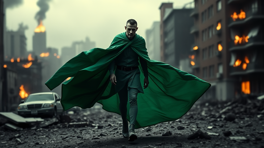 Man clad in a flowing emerald cloak, a city consumed by flames in the background. The urban landscape lies in ruins, signaling the apocalypse, yet he strides forward with a confident grace. The scene is hazy and blurred, capturing a sense of surrealism in its monochrome tones. His form is distorted with a patchwork of strange anatomy—unclear eyes, asymmetrical features, and an almost fluid-like movement. Despite the chaos, there is a strange beauty in the destruction, each step he takes echoing the end of an era. The image carries an ethereal quality, reminiscent of a low-resolution digital render, like a mirage fading into obscurity.