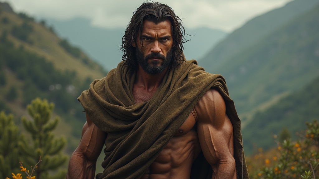 A rugged man enveloped in weathered cloth stands prominently, his muscular build reflecting strength and resilience. His face, strikingly handsome, captures your attention with its lifelike detail and natural colors. The background is meticulously detailed, enhancing the scene's realism, while crisp lighting accentuates every feature. Set within a lush landscape, the artwork exudes photorealism with an 8k resolution. This piece is trending on Tumblr, reminiscent of the styles of Artgerm, Greg Rutkowski, Alphonse Mucha, Loish, and WLOP, blending their influences into a unique visual masterpiece.