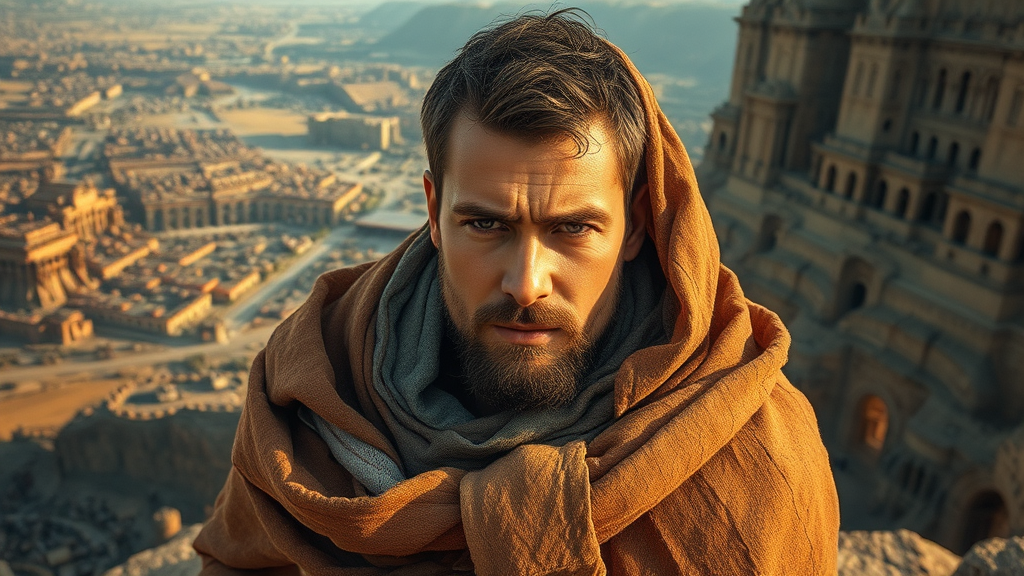 Man enveloped in weathered cloth, set against a sprawling and intricate background, exuding strength and allure with a meticulously detailed visage and harmonious natural hues. Captured in stunning photorealism at an 8k resolution, the crisp lighting enhances the scene, reminiscent of trending artistic styles. Inspired by the renowned works of Artgerm, Greg Rutkowski, Alphonse Mucha, Loish, and WLOP, this piece combines their distinctive touches while maintaining its own creative essence.