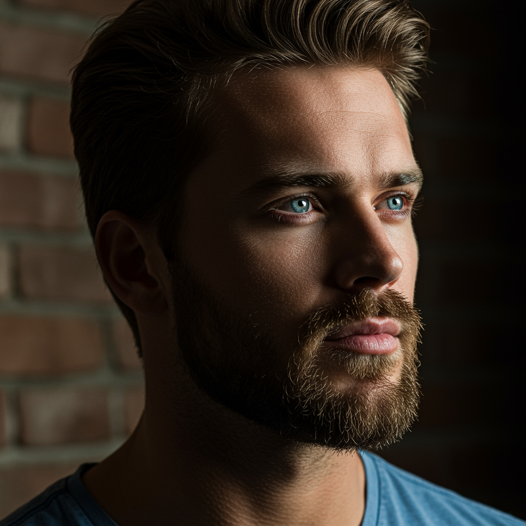 A striking man with defined features gazes self-assuredly into the distance. His well-maintained rugged beard complements his intense blue eyes, which catch the gentle glow of low lighting. He is positioned against a textured brick backdrop, a shadow enhancing the prominence of his strong jawline. The ambiance is softly lit, creating an atmosphere of tranquility and reflection.