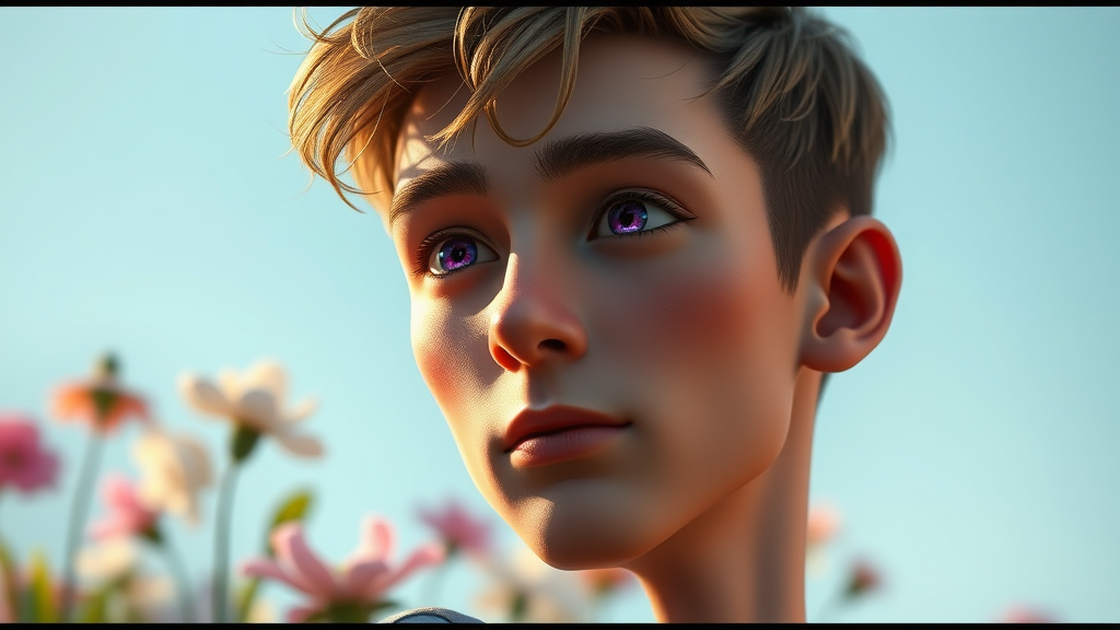 Man, solo, piercing purple eyes, detailed, breathtaking, cinematic lighting, daytime, dynamic lighting, simple background, depth of field, casual clothes, flowers, cropped, bold, side view, CGI, 3D, plain, youthful, vibrant.