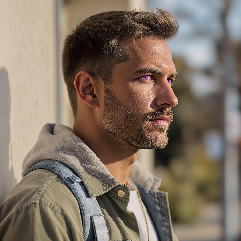 man, solo, piercing purple eyes, finely detailed, breathtaking, cinematic lighting, daytime, dynamic lighting, simple background, depth of field, CG, casual clothes, soft colors, high quality, side view, clear focus, masculine, mature, confident.