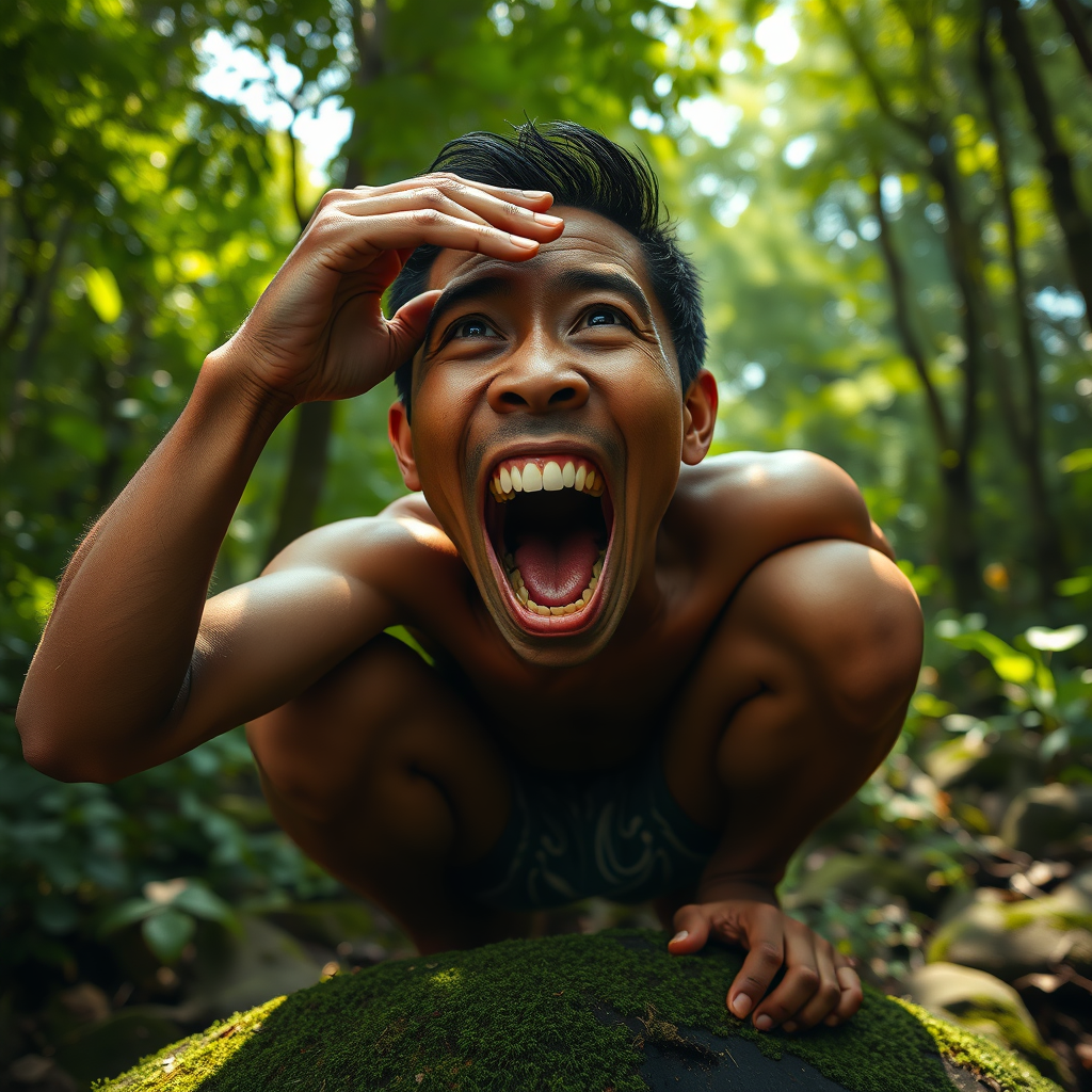 An Indonesian man, squatting on a moss-covered rock, opened his mouth as wide as humanly possible, showcasing a set of perfectly aligned teeth. One hand was placed on his forehead in a gesture of thoughtful respect, his eyes scanning the vibrant, lush forest surrounding him as if in search of something elusive. The hyper-realistic scene captures the interplay of dappled sunlight filtering through the verdant canopy above, casting intricate shadows on his face and highlighting the intense curiosity in his expression. His other hand lightly rested on his knee, balancing the dynamic posture amidst the serene and untouched beauty of nature, enhancing the feeling of a moment suspended in exploration and wonder.