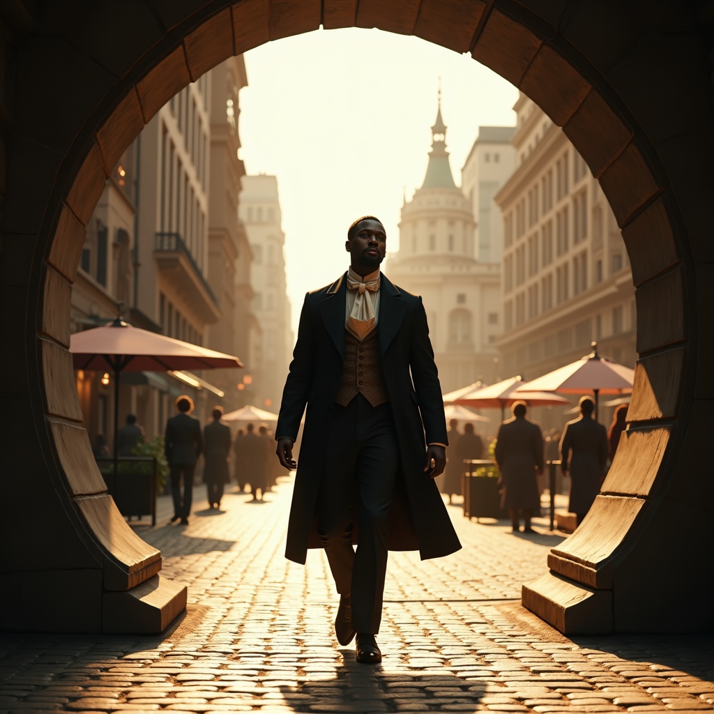 A black man in an authentic Victorian suit steps out of a swirling time portal into a modern-day city plaza. The camera captures him from a low angle, enhancing his presence as he gazes around in wonder and confusion. Behind him, the Victorian cobblestone courtyard remains visible through the portal. The shot, in stunning 8k resolution, contrasts his historical attire with the bustling cityscape and futuristic technology that surrounds him. Bathed in warm, golden light, the scene exudes a surreal quality. Composed with the Golden Ratio, the man is the focal point, while the surrounding architecture and people balance the frame, emphasizing his isolation in this new world. This awe-inspiring, visually striking moment, directed by Christopher Nolan, is part of an epic, genre-bending film. The shot's photorealistic, hyperrealistic details—matte skin, soft lighting, and heavy shadows—add to its masterpiece quality, offering a unique visual flair inspired by the dieselpunk aesthetic.