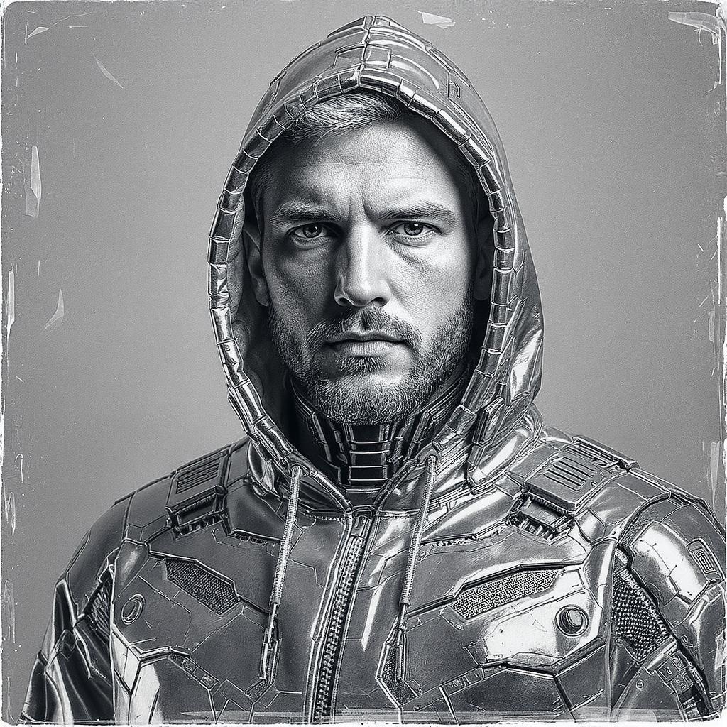 View this AI-generated image featuring a portrait of a white man wearing a sleek hoodie designed with cyberpunk aesthetics featuring intricate robotic motifs and an overall shiny glossy appearance the composition embodies controlled chaos with elements of symmetrical asymmetry the color palette is d
