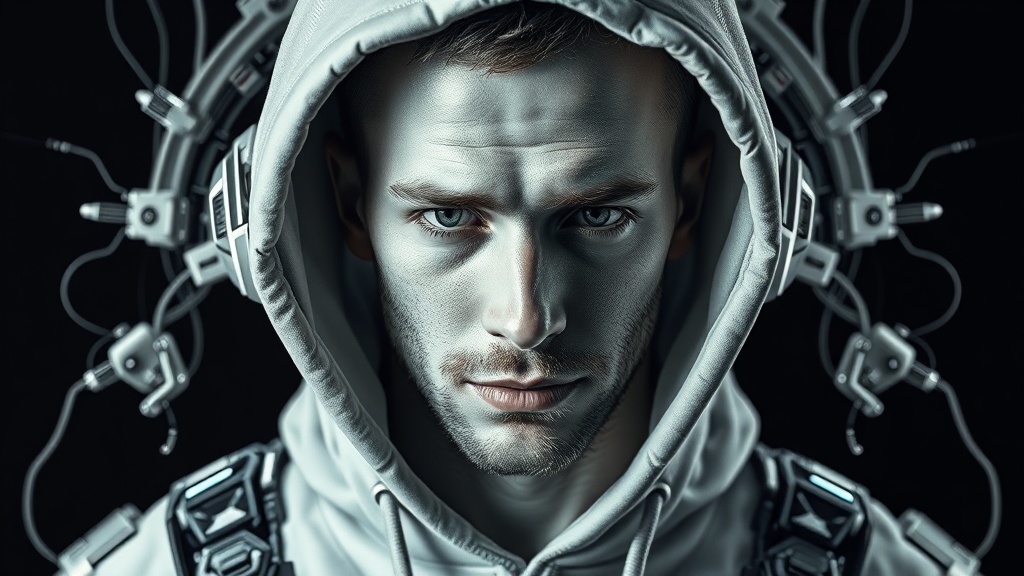 A portrait of a white man wearing a hoodie, depicted in a cyberpunk style with robotic elements. The image features a shiny and glossy finish, capturing a sense of controlled chaos intertwined with symmetrical asymmetry. The color palette is dominated by dark white and silver tones, reminiscent of an associated press photo. The overall composition blends futuristic motifs with a hint of human vulnerability, creating a captivating visual experience.