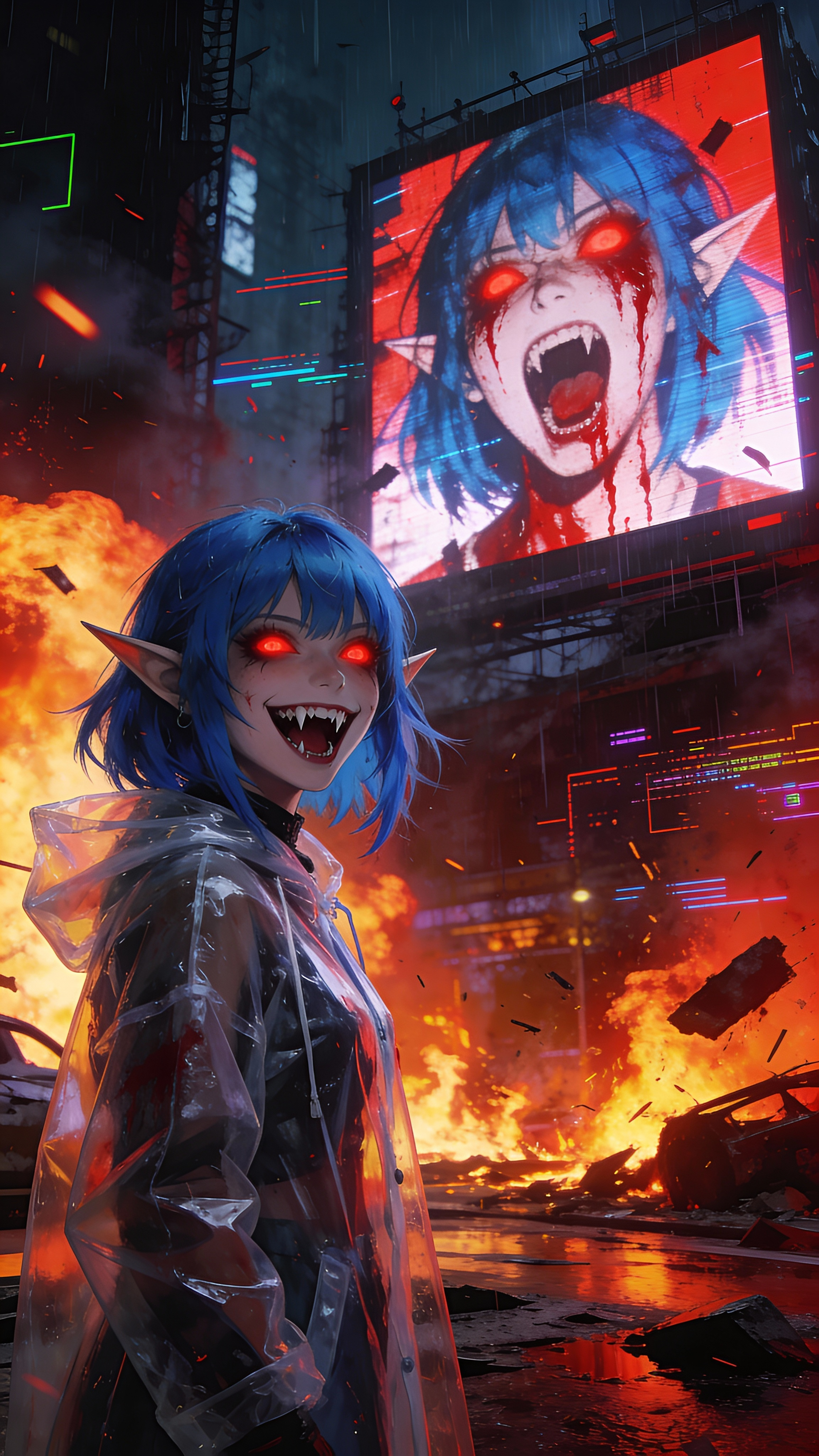 (masterpiece, best quality:1.2), intense atmosphere, horror cyberpunk, elf girl with blue hair, crazy expression, manic laughter, sharp fangs, evil smile, glowing red eyes, yandere, wearing transparent plastic raincoat, chaos in background, city in flames, fire and explosions, (large digital billboard in background showing a screaming face with bleeding eyes:1.2), cinematic dynamic lighting, high contrast, vivid red and orange colors, destruction, burning streets, glitch artifacts.