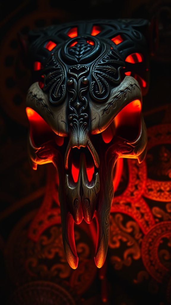 Maori inspired intricately carved bone skull, cinematic lighting, rich textures, artistic photography, cultural symbolism, ethereal atmosphere