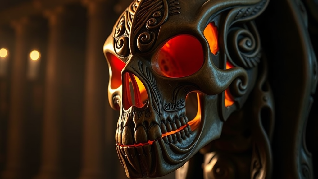 Maori-inspired intricately carved skull with cinematic lighting and dramatic emphasis on ornate details.