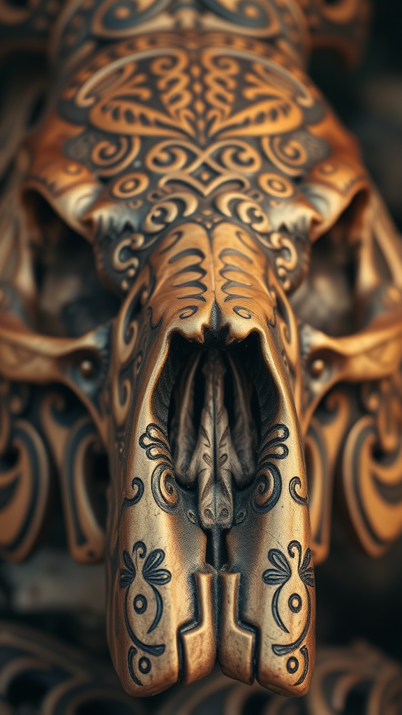 Maori intricately engraved skull high-resolution cinematic photograph rich in cultural detail.