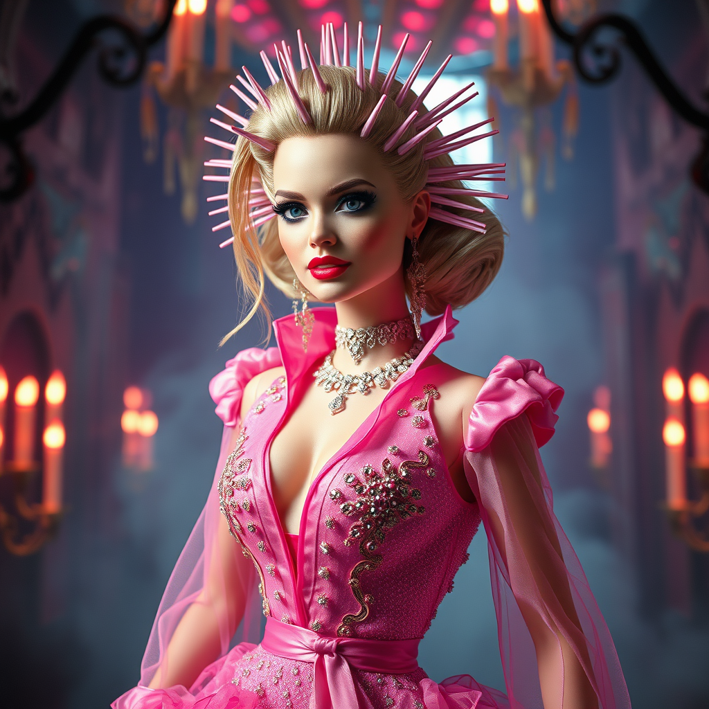 Margot Robbie as a glamorous Barbie in a captivating fusion with Hellraiser's Pinhead, adorned in a dazzling pink ensemble against a surreal, eerie backdrop, blending elegance with a hint of dark mystery, ethereal atmosphere, enhanced by imaginative details and vivid color contrasts.