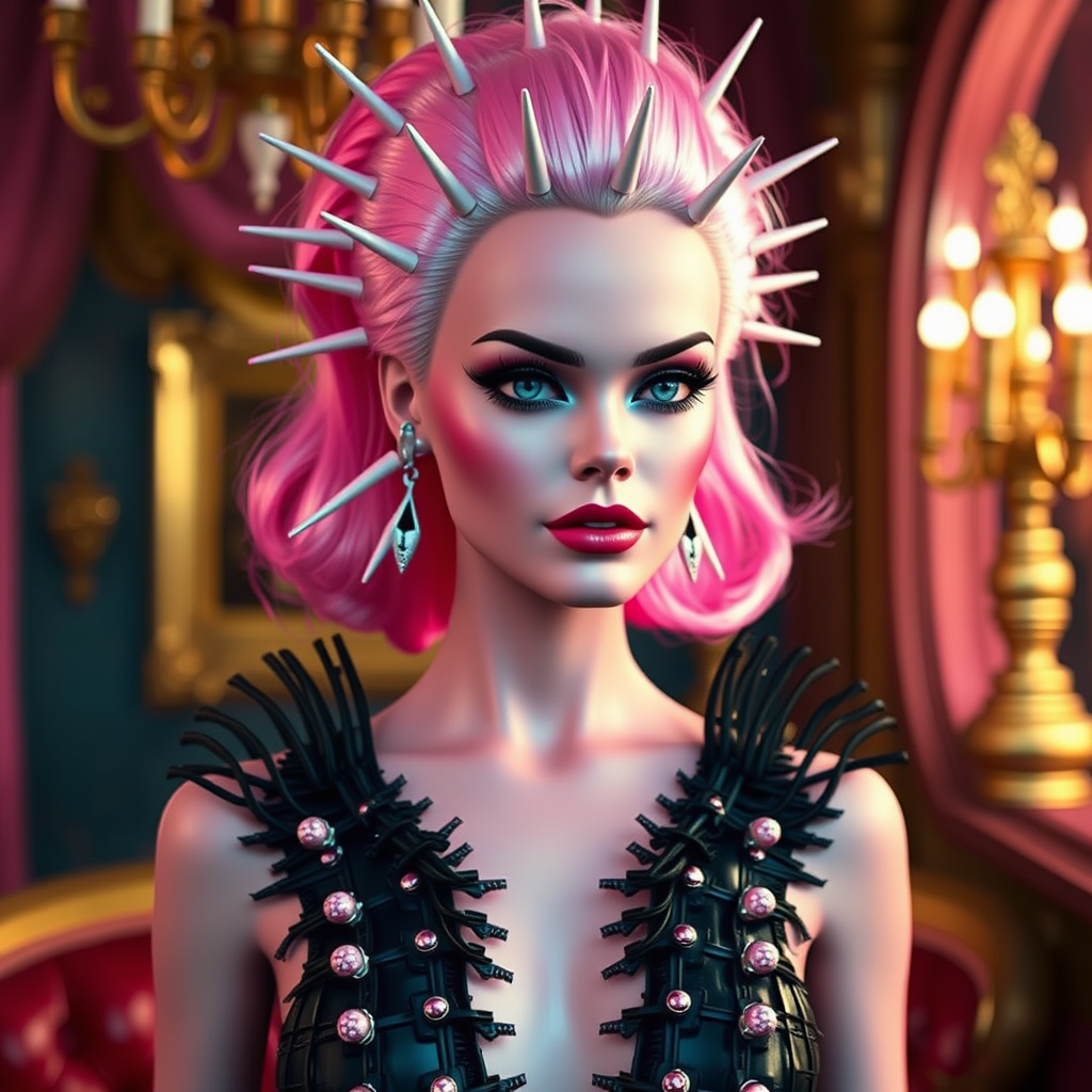 Margot Robbie as a stylized Barbie-esque figure, blending vibrant pink hues with the dark, intricate designs of Hellraiser's Pinhead, set against a surreal backdrop that merges glamour and horror elements, evoking a charismatic yet eerie allure.