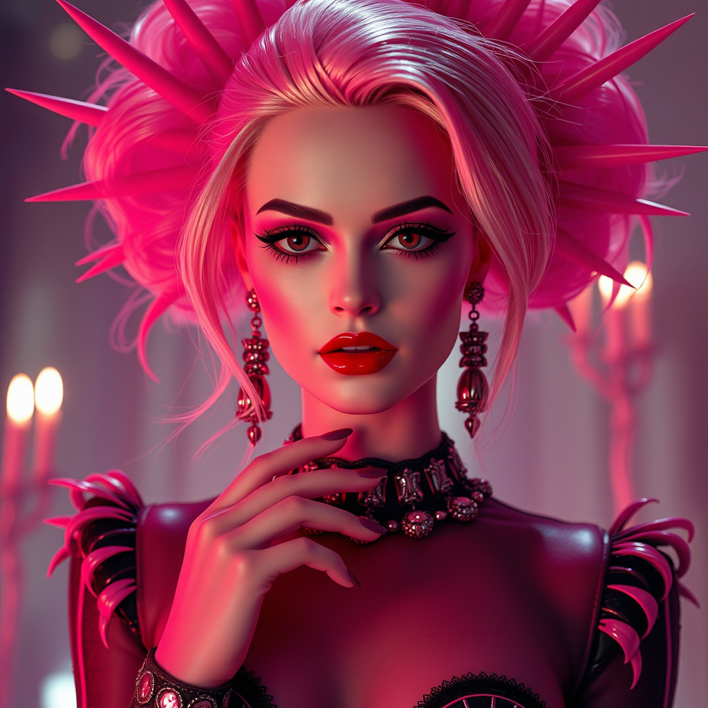 Margot Robbie in a surreal fusion of Barbie and Hellraiser, embodying a captivating blend of elegance and horror, with Pinhead's iconic aesthetic reimagined in vibrant pink tones, surrounded by an eerie yet glamorous atmosphere.