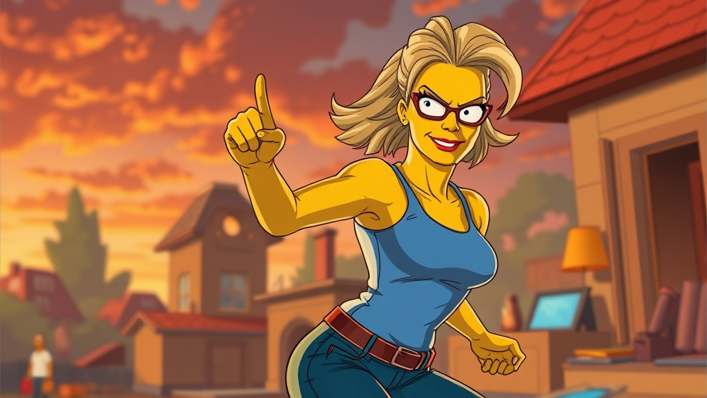 Margot Robbie styled character from The Simpsons created in the signature Matt Groening style, full body view, dynamic action pose, cinematic and epic scene with a background that complements her character, vibrant rim lighting, enhanced color grading, subtle light shading, intricately detailed, high-resolution 4k image, vividly colorful, aspect ratio 2:3, quality level 2, version 4.