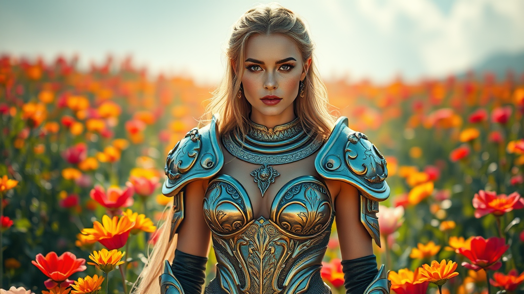 margotrobbie inspired hyperrealistic full length portrait of a stunning goddess in a field of vibrant flowers with a captivating face, clad in intricately designed revealing armor, illuminated by god rays; a highly detailed and elegant composition showcasing realistic and cinematic character design, digital artwork with depth, resembling 3d rendered illustration; avoid_low_quality, cropped, duplication, deformation, blurry, bad_anatomy, incorrect_proportions, disfigurement, and anomalies in fingers or limbs.