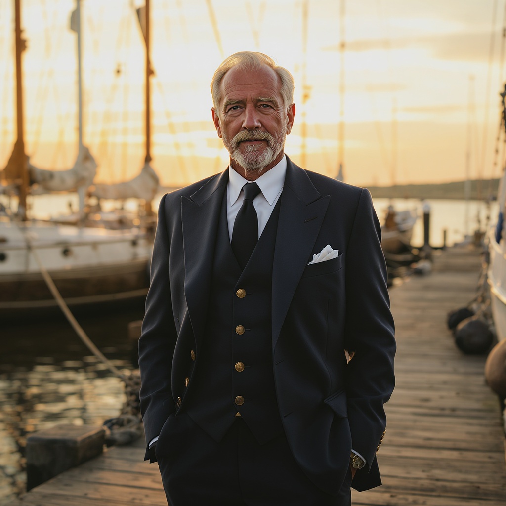 A distinguished mariner with the salt of the sea still in his veins, his weathered face contrasts with his impeccably tailored attire, exuding an air of elegance that complements his adventurous spirit.
