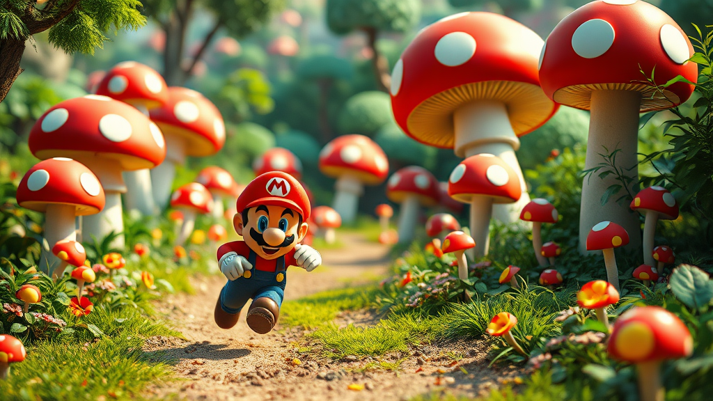 Mario dashing through the vibrant Mushroom Kingdom, lush background teeming with oversized mushrooms, rendered in stunning 32k resolution, closeup view capturing intricate details, trending on poltcount 3D, immersive game atmosphere, dynamic movement, version 5.2, aspect ratio 2:3, with enhanced sharpness at a smooth quality of 2.