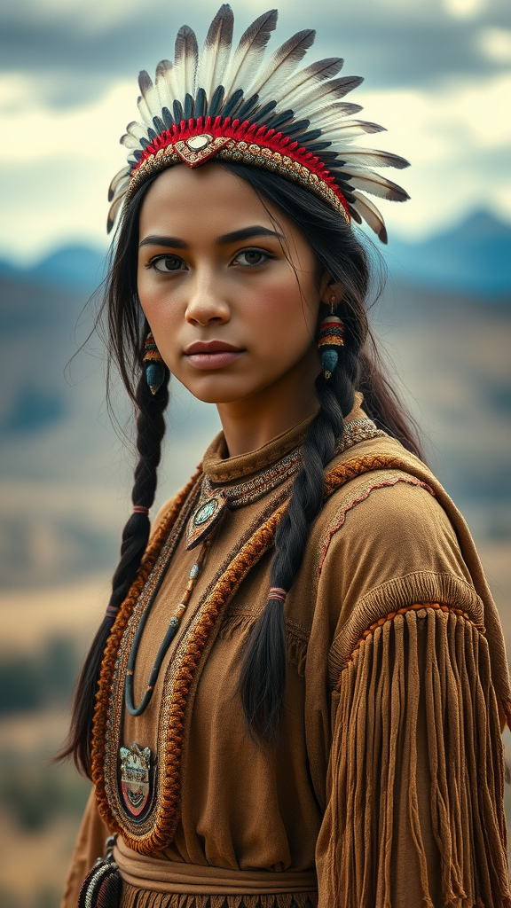 Marisa Quintanilla as a reimagined Sacagawea, captivating young Native American woman, flawlessly symmetrical features, adorned with feathered and beaded jewelry, wearing an intricately crafted traditional dress and handmade moccasins; embodies the spirit of a skilled huntress and warrior, set against the breathtaking backdrop of a wild west Montana landscape, photorealistic image capturing elegance and complexity, highly detailed with a rich depth of field, front view perspective, ultra-high resolution, shot with cinematic quality on 65mm film, capturing every nuance in vivid 22 megapixels.