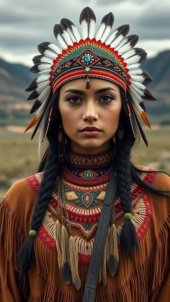 Marisa Quintanilla as a young, captivating Native American woman inspired by Sacagawea, showcasing an exquisitely symmetrical face framed by feathered and beaded jewelry. She wears a meticulously crafted traditional dress paired with handmade moccasins, embodying the essence of a fierce, armed huntress and warrior. Set against the expansive backdrop of a wild west Montana landscape, the scene is captured in stunning photorealistic detail. The image is elegant and complex, featuring extraordinary intricacy and depth of field, presented in an ultra-realistic 8k resolution with a front view shot on a 65mm lens, 22 megapixels.