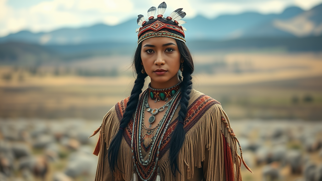 Marisa Quintanilla portraying a young, strikingly beautiful Native American woman reminiscent of Sacagawea, possessing a perfectly symmetrical face and wearing exquisite feather and beaded jewelry. She is adorned in a traditional, meticulously handcrafted dress and moccasins, embodying the spirit of a female hunter and warrior. Set against the vast, untamed landscapes of the wild west in Montana, this scene is photorealistic and ultra-realistic. The image captures her elegance and intricacies with high detail, featuring depth of field in a front-facing view. The composition, inspired by a shot on a 65mm camera with 22 megapixels, provides an 8K resolution, emphasizing a sense of grace and strength.