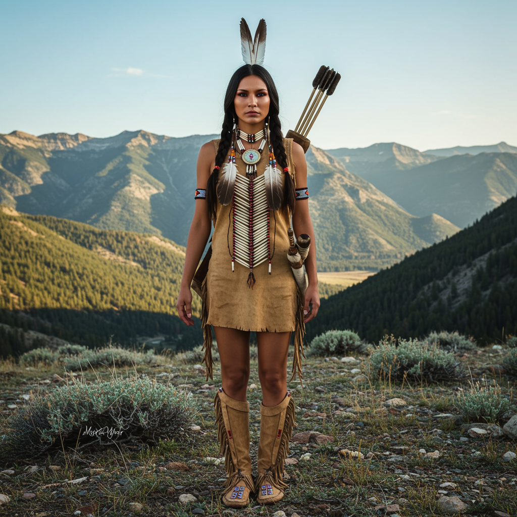 Marisa Quintanilla portraying Sacagawea, a strikingly beautiful Native American woman with a perfect, symmetrical face, adorned in feather and bead jewelry. She wears a traditional handmade dress and moccasins, embodying the essence of an armed female hunter-warrior. Set against the wild west backdrop of a breathtaking Montana landscape, the scene is photorealistic and ultra-detailed. The depiction is elegant and intricate, with a remarkable depth of field. Captured from the front view in 8k resolution, utilizing a 65mm lens at 22 megapixels, the image conveys a sense of historical authenticity and natural beauty.