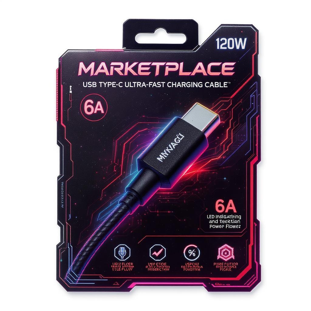 Marketplace card featuring a futuristic cyberpunk design showcasing a USB Type-C ultra-fast charging cable, capable of 6A at 120W, with integrated dynamic LED indicators illuminating the power flow.
