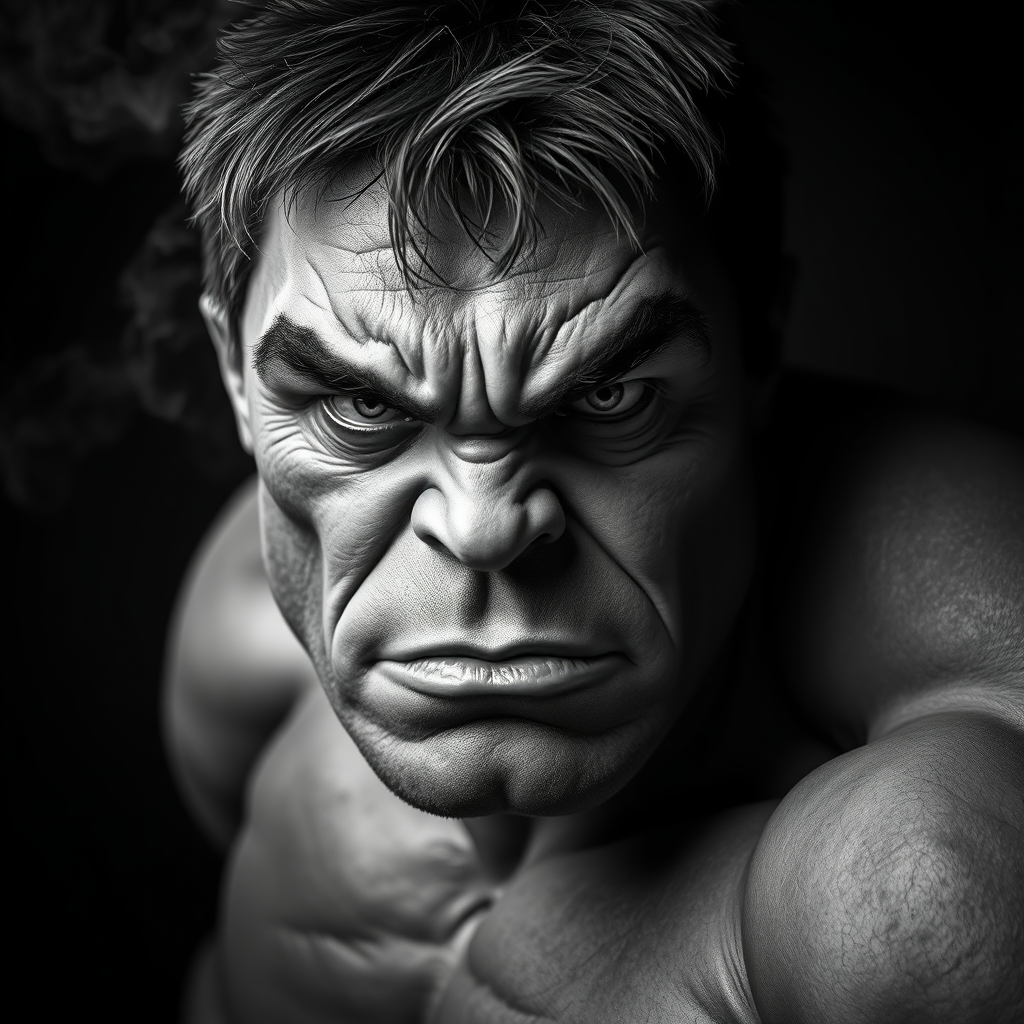 Marvelous depiction of the Hulk superhero captured by Lee Jeffries, featuring intensely expressive eyes against a dark backdrop, showcasing a perfectly proportioned physique. The scene is enhanced by photo-realistic attire, extreme detail, and high contrast in HD and HDR quality. Utilizing techniques like ray tracing and subsurface scattering, presented in striking black and white, with atmospheric smoke effects reminiscent of Unreal Engine 5. Rendered with Octane and V-Ray for a highly detailed and ultra-realistic finish. Volumetric lighting brings depth, shot with the Hasselblad X1D-50c and XCD 120mm f/3.5 lens at ISO 200, achieving sharp focus in a full body, full frame composition. Captured in 8k resolution, aspect ratio of 9:18, retaining the essence of a dynamic and powerful portrayal.