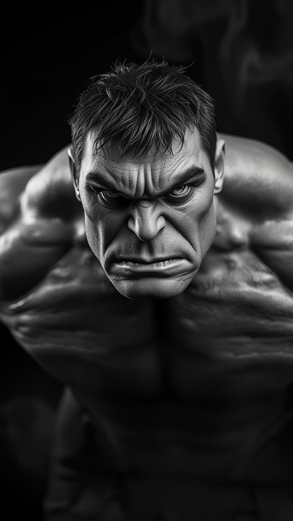 Marvel's Hulk superhero captured in an intense photo by Lee Jeffries, featuring expressive eyes and set against a dark backdrop. The Hulk is depicted with a proportionate body and photo-realistic clothing. The image is rendered with extreme detail, high contrast, and in high definition, utilizing HDR, ray tracing, and subsurface scattering. Presented in striking black and white, with subtle smoke effects, the scene leverages Unreal Engine 5, Octane Render, and V-Ray for maximum detail. Enhanced by volumetric lighting, the composition is shot with a Hasselblad X1D-50c, paired with an XCD 120mm f/3.5 lens, set at ISO 200 for sharp focus. Crafted as a full-body shot, the image is presented in 8k resolution, emphasizing ultra detail and harnessing the cinematic aspect ratio of 9:18, bringing the powerful figure of the Hulk to life in dynamic clarity.