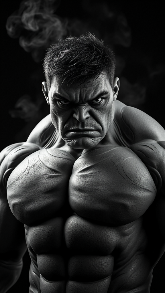 Marvel's Hulk superhero captured in the style of Lee Jeffries, featuring expressive eyes against a dark backdrop, with a proportionate physique. The image showcases photo-realistic clothing with extreme detail and high contrast in a black and white setting. Employing HDR with ray tracing and subsurface scattering, it integrates smoke effects using Unreal Engine 5, Octane Render, and V-Ray for ultra-high detail. The scene features volumetric lighting with a Hasselblad X1D-50c and XCD 120mm f/3.5 lens at ISO 200 to ensure sharp focus. The full-body shot is captured in 8k resolution, maintaining an aspect ratio of 9:18 for a dramatic and immersive visual experience. Subtle creative modifications include dynamic fabric textures and enhanced lighting contrasts to accentuate Hulk's powerful presence.