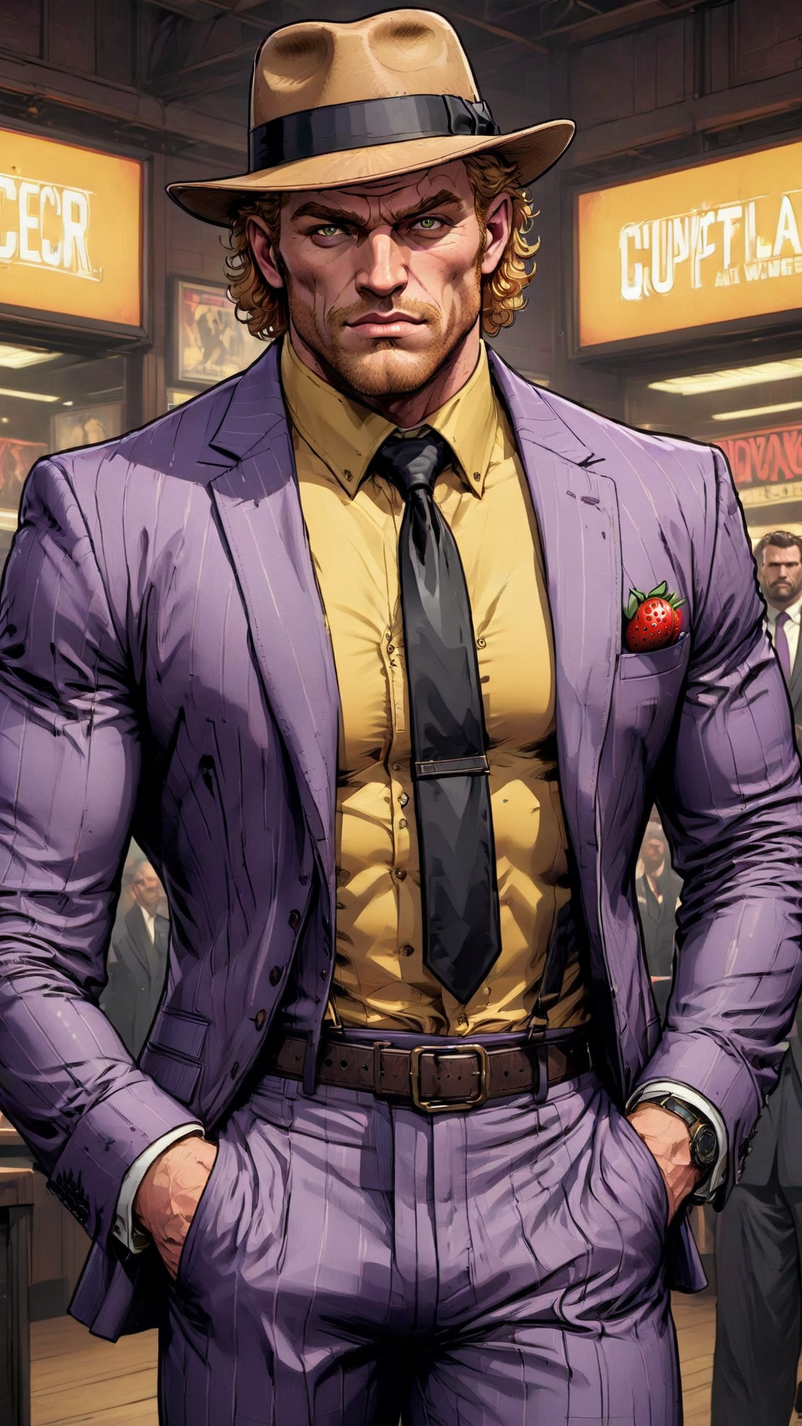 masculine male. Young Caucasian male. bodyguard, wrestler. Dwarf, short, stocky, solid, massively muscled. Average looks, but strong jawed. Short curly strawberry-blonde hair, tousled and unruly, but he wears a black wide brimmed fedora on top of that. Light brown eyes, intense gaze. Soul-patch on face. Yellow button down shirt with black tie, pale lavender suit jacket. Dark purple dress pants with light purple pinstripes, black leather dress boots. Wide hands with big knuckles, perfect for punching. Full body pose, wrestlers stance.