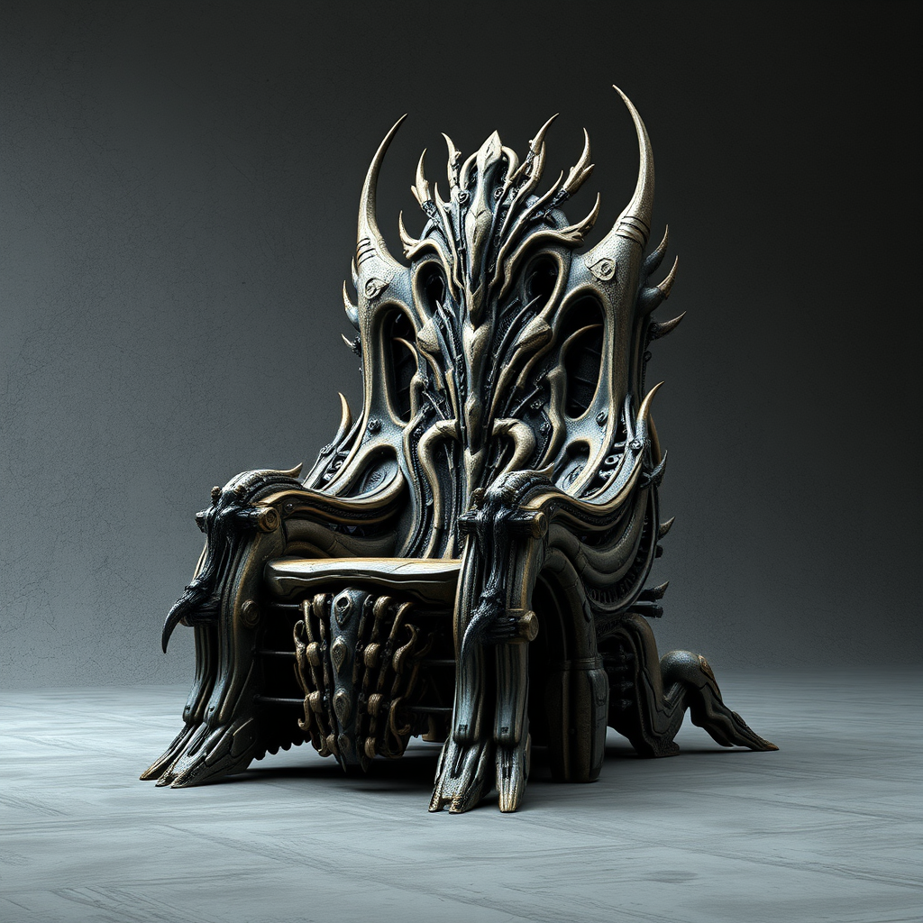 Massive bio-mechanical throne in the style of HR Giger, concept furniture, set against a textured grey backdrop, hyper realistic, digital illustration, popular on artstation, richly detailed, fine detail, complex design, viewed from a dynamic diagonal angle.