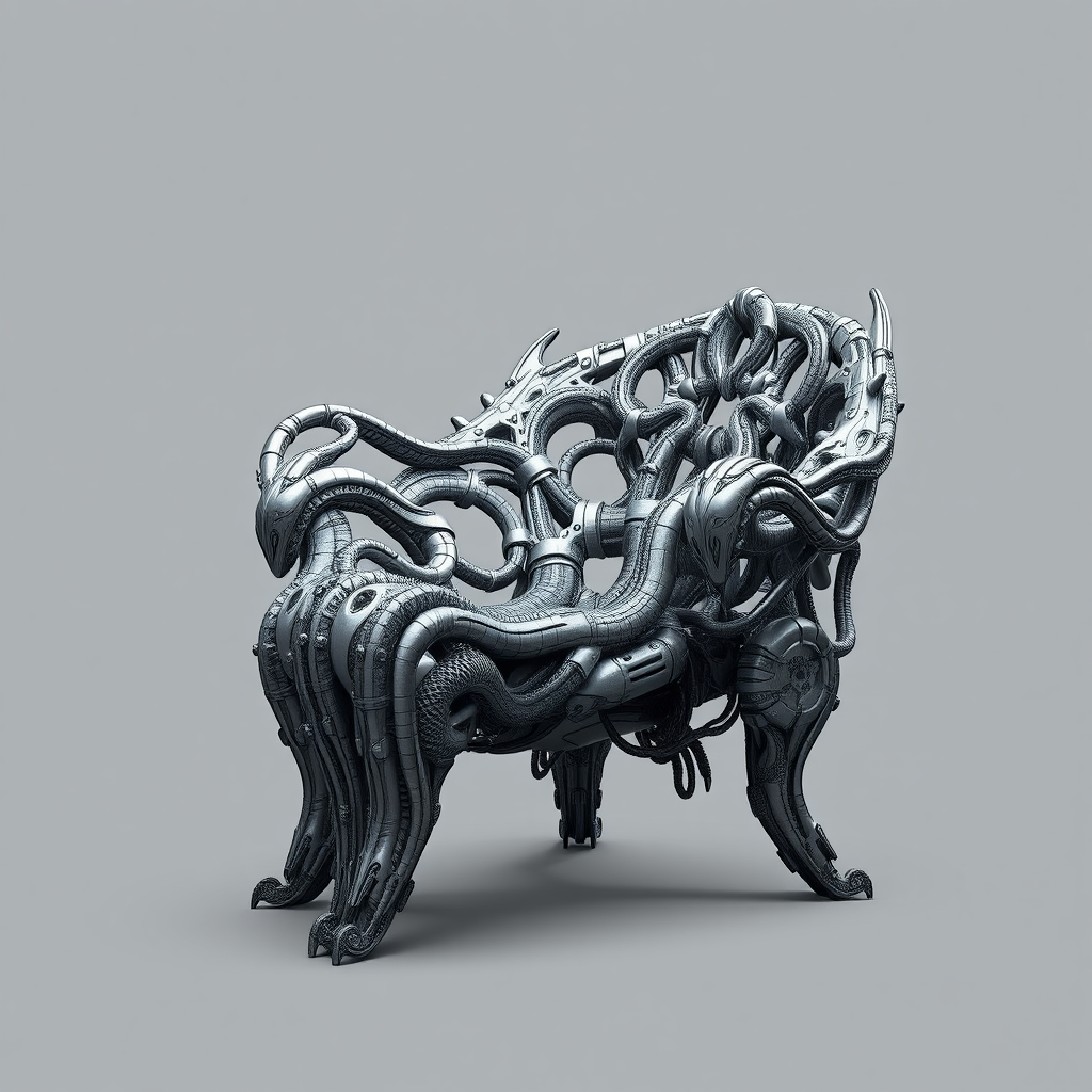 Massive biomechanical-inspired H.R. Giger-style chair, featuring concept furniture elements, intricately detailed with an elaborate structure, presented on a muted grey background; hyper-realistic digital art illustration with an organic, surreal design; trending artwork with extraordinary fine details, captured from a dynamic diagonal view, subtly infused with a dark, enigmatic theme, adding a touch of otherworldly intrigue; the chair's form intertwined with alien-like patterns, creating an exquisite fusion of art and functionality.