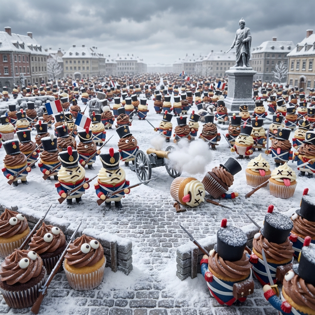 An epic battle unfolds in a snow-covered city square, featuring an army of anthropomorphic cupcakes dressed as soldiers. The scene captures the chaos and emotions of war with determined and fearful expressions, and some fallen cupcakes.