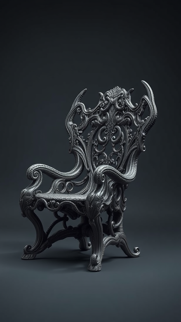 Massive HR Giger-inspired chair with an ornate, biomechanical design, set against a moody gray background, featuring hyper-realistic digital art techniques. The intricate details and fine craftsmanship highlight elements of organic and mechanical fusion, showcasing an elaborate structure with sinewy, intertwining patterns. The chair is illustrated from a diagonal perspective, revealing its complex textures and otherworldly elegance. With nuances of dark elegance and surreal aesthetics, this concept furniture piece captures a sense of haunting beauty and futuristic artistry, invoking a sense of curiosity and wonder, trending on art platforms like ArtStation.