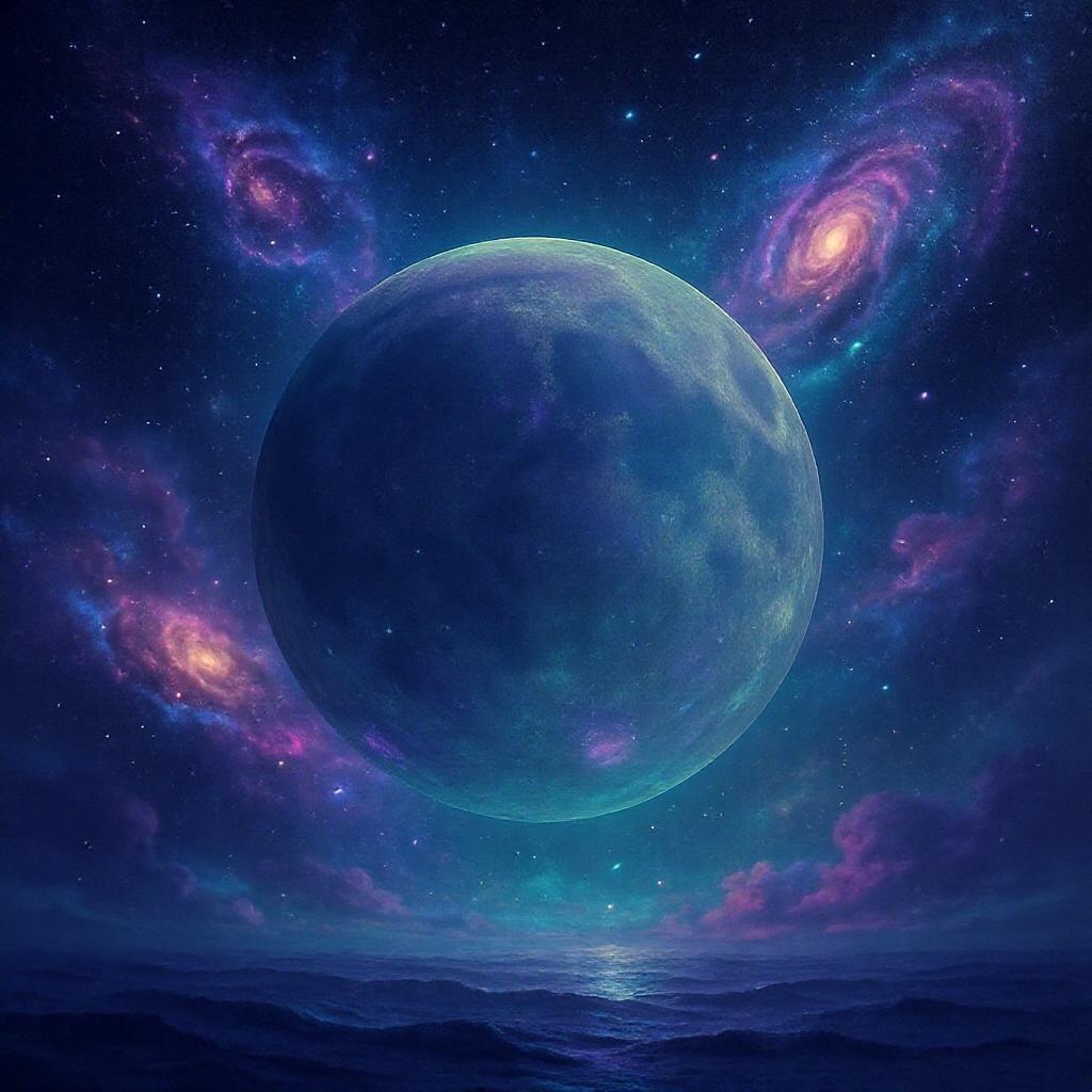 Massive moon descending onto the surface amidst swirling neighboring galaxies, infused with vibrant and surreal colors dominated by blues and purples, evoking a cosmic and otherworldly ambiance. The scene unfolds in an abstract, dreamlike style, teetering on the edge of reality, capturing the surreal essence of this celestial spectacle, with the atmosphere shimmering in ethereal hues.