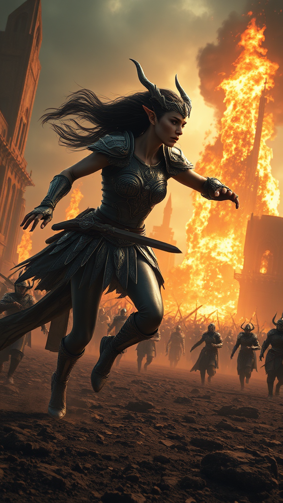 massive scale battle, fierce women warriors, stunning and powerful elf, captivating beauty in epic confrontation, dynamic run and pose captured in slow motion, immense power and goddess-like rage, intricately designed armor and weaponry, ancient and forgotten battlefield, towering flames as backdrop, epic wide shot with aerial perspective, intense dark fantasy atmosphere, photorealistic CGI with intricate detail, complex and maximalist scene, hyperrealistic depth focus, sunbeams cutting through with crepuscular rays, inspired by Dragon Age style visuals, ratio 3:2, quality level 2