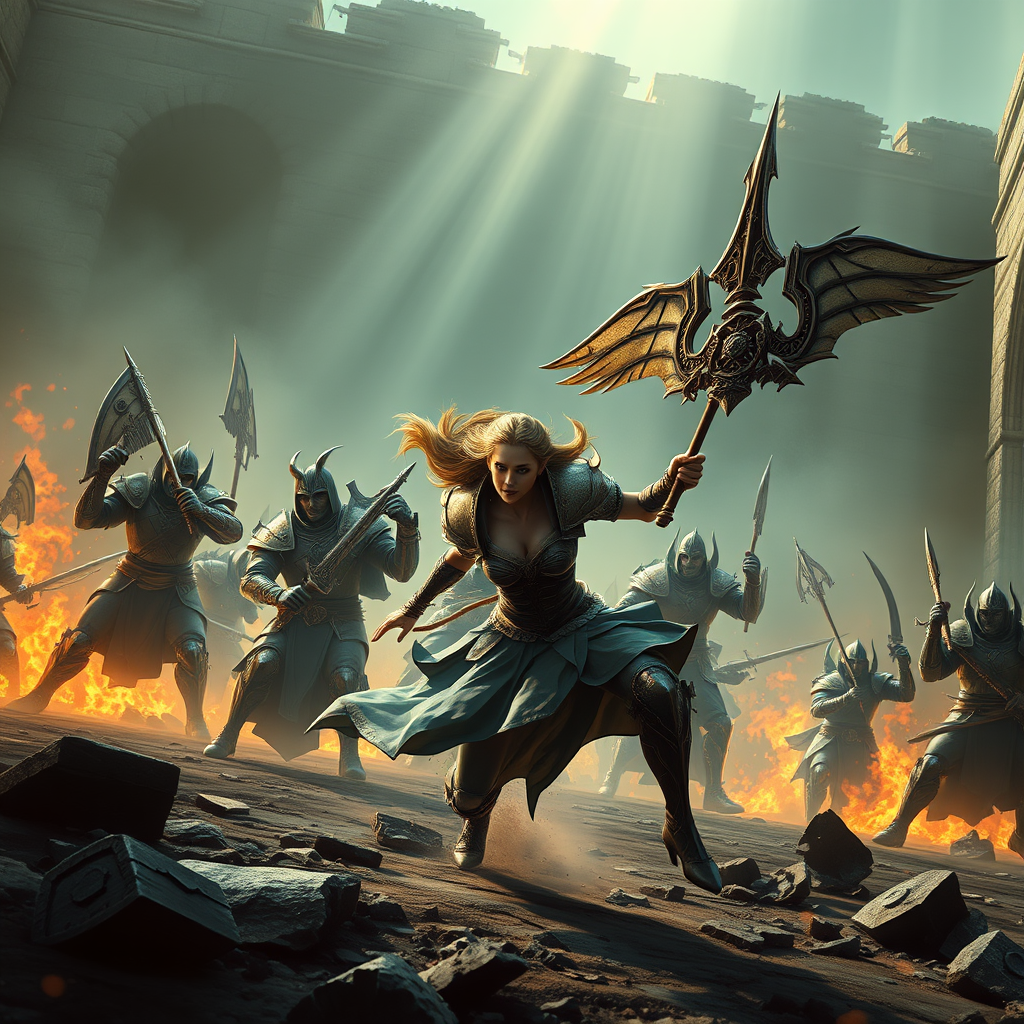 Massive scale warriors woman elf gorgeous beautiful epic battle running pose slow motion powerful rage goddess intricate armor weapon ancient battlefield fiery wall background occlusion epic wide shot aerial perspective dark fantasy CGI depth focus sunbeams realistic detailed complex maximalist hyperrealistic in the style of Diablo.