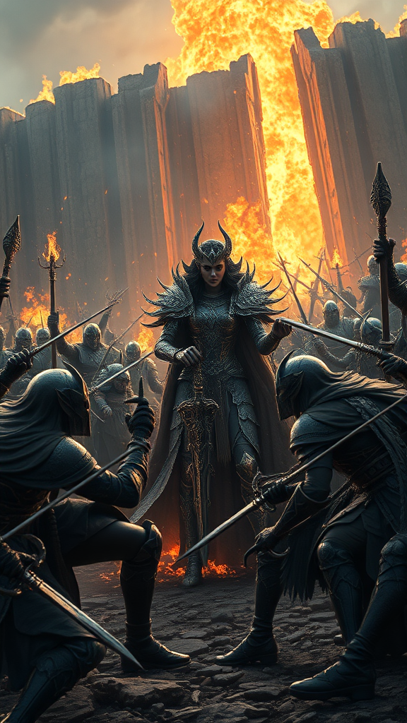 Massivescale battle with fierce warrior elves, featuring a stunningly beautiful and powerful goddess at the center, her rage manifesting in each strike. Intricate armor glistens, and her elaborate weapon cleaves through the chaos on a forgotten battlefield. A towering wall of fire serves as the background amidst epic slow-motion sequences. The scene captures an epic wide shot from an aerial perspective, embracing the essence of dark fantasy. The setting is enriched by the play of CGI with depth focus, where crepuscular rays and sunbeams penetrate the scene, casting a photorealistic and hyperrealistic glow. Every element is detailed and complicated, exuding a maximalist style with a distinct Dragon Age flair.